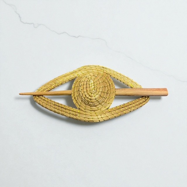 Pic cheveux ajustable finement tressé en or végétal (capim dourado) avec baton en bois naturel.