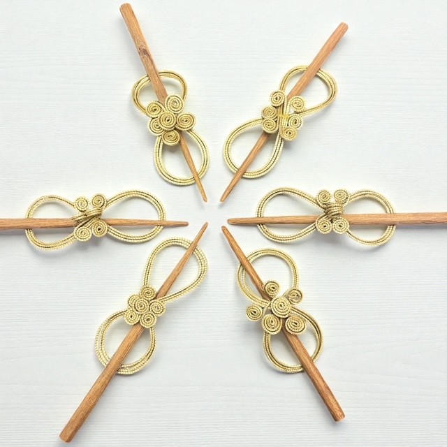 Pic cheveux ajustable finement tressé en or végétal (capim dourado) avec baton en bois naturel.