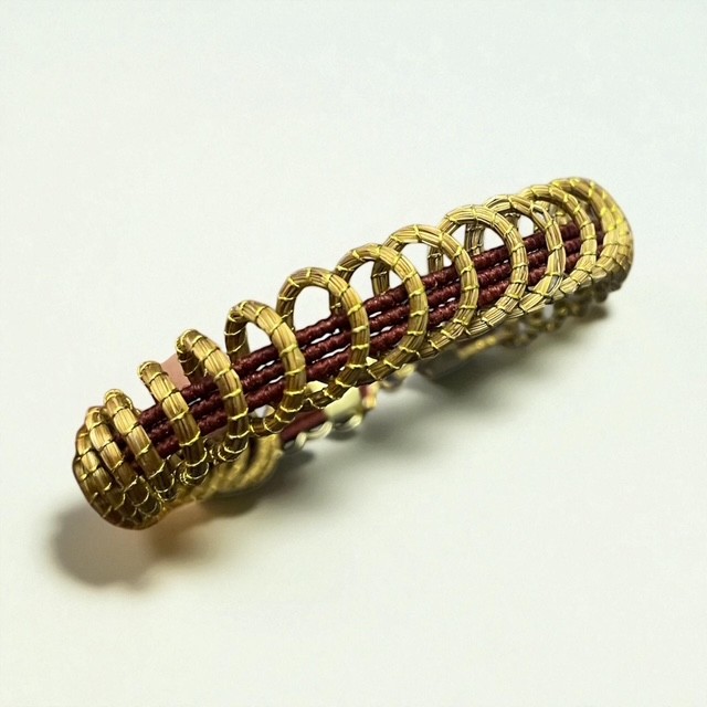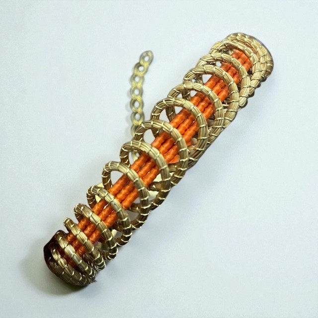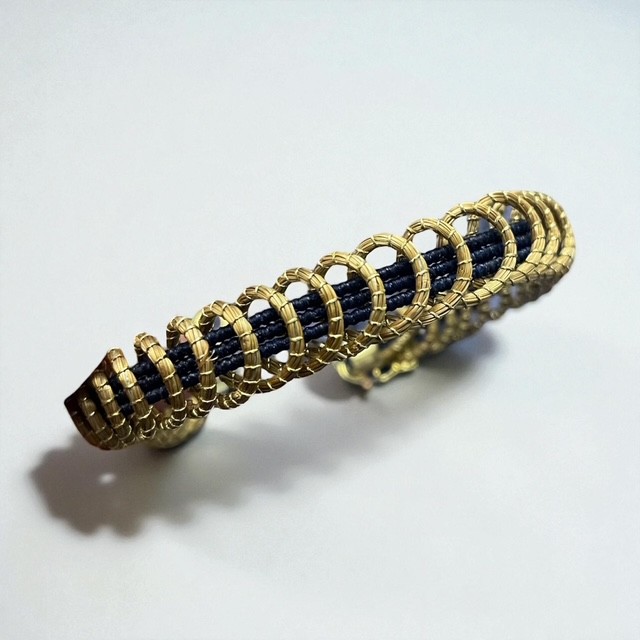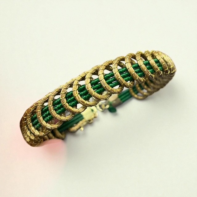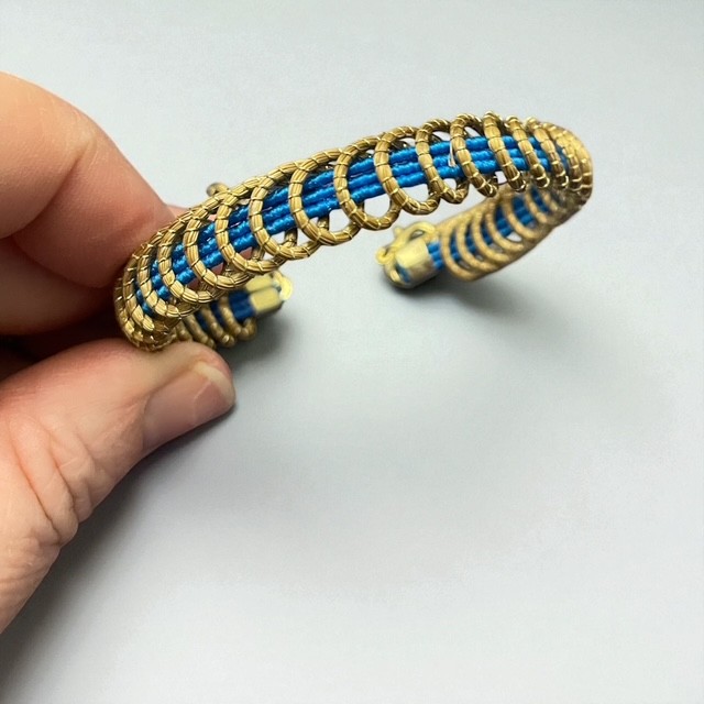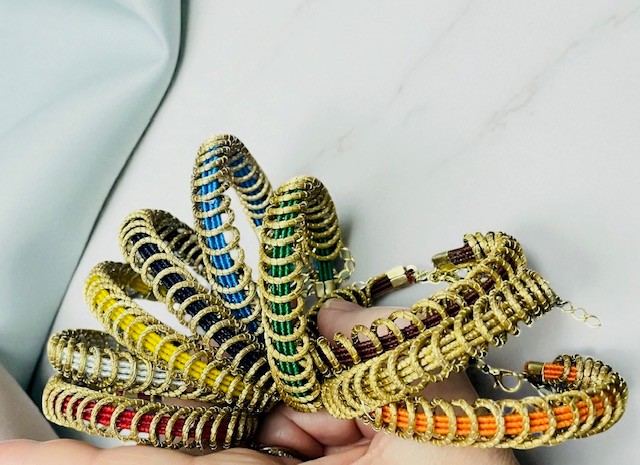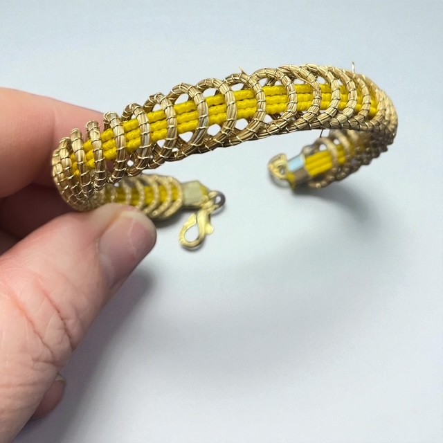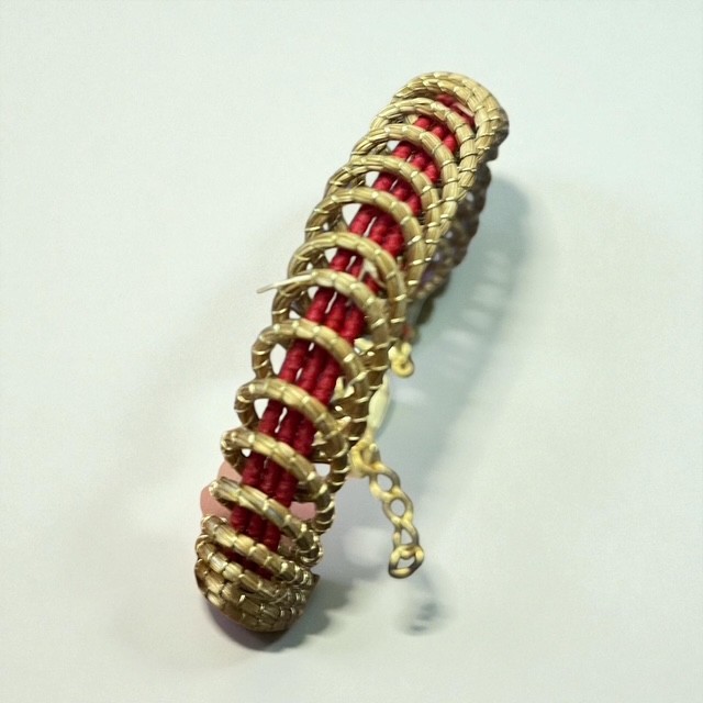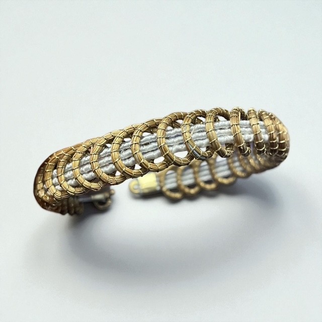 Manchette en or végétal (capim dourado) avec fil de soie de buriti et coton coloré.