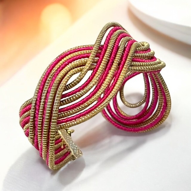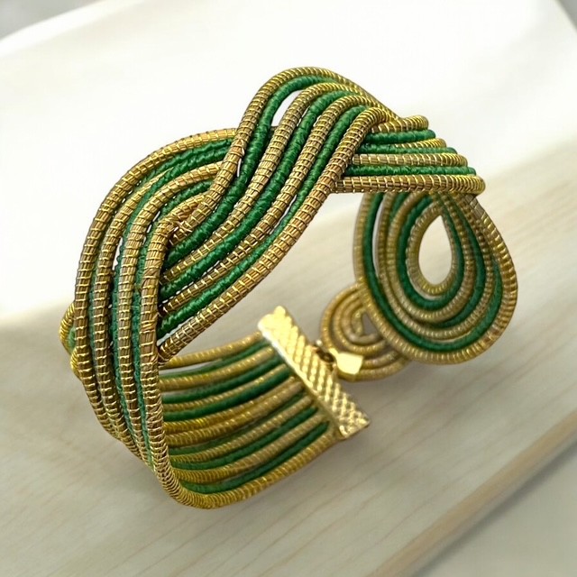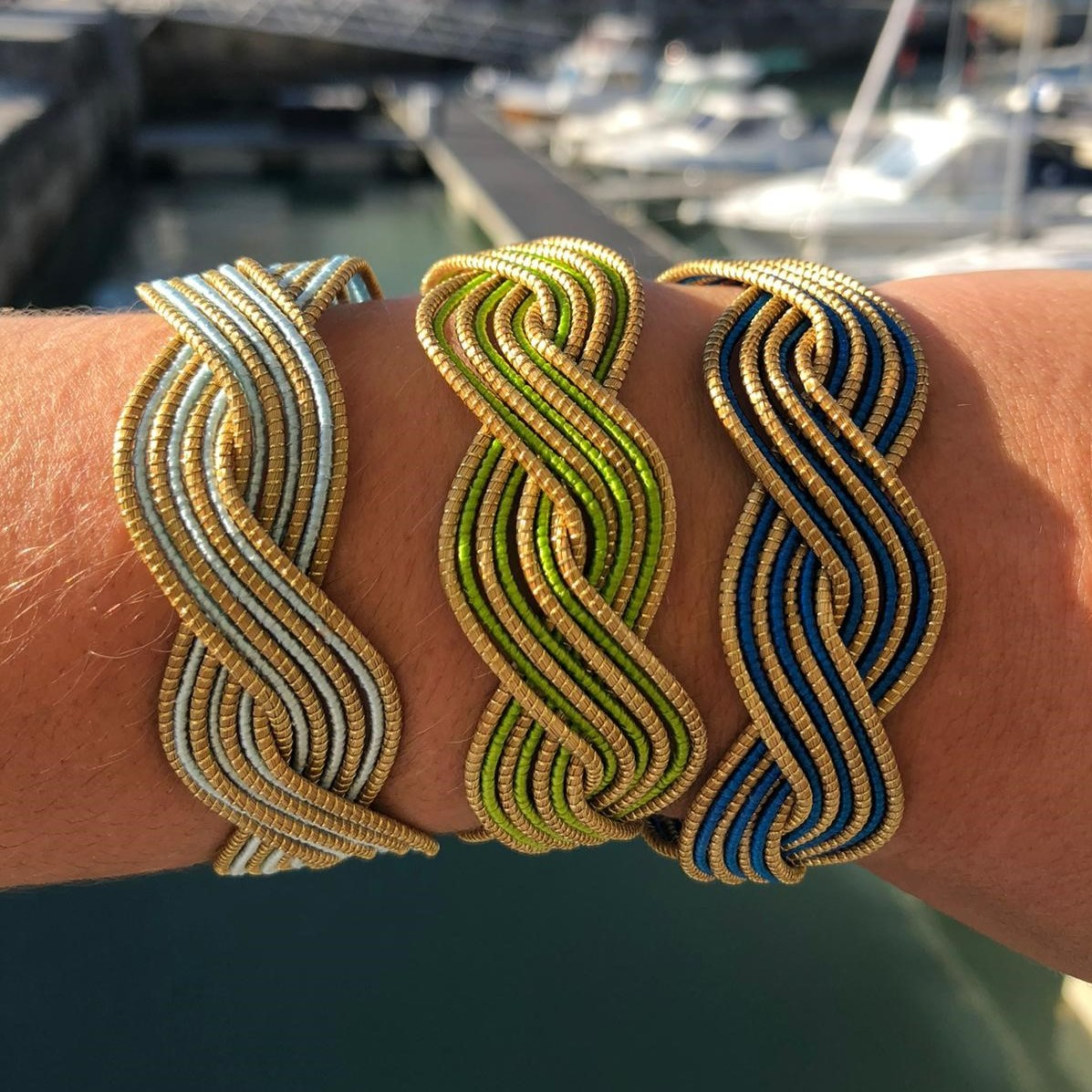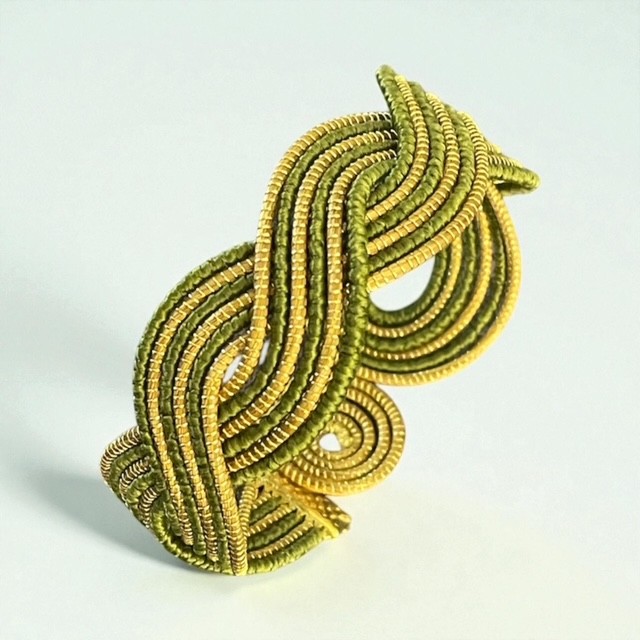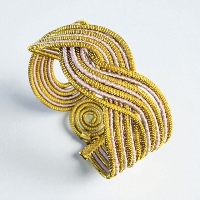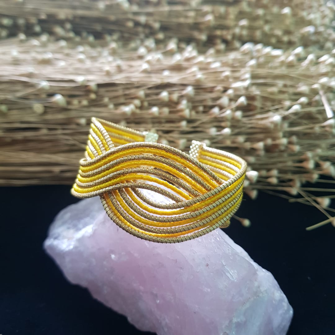 Manchette tressée en or végétal (capim dourado) et fil de soie de buriti.