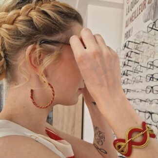 Pair of earrings finely woven in golden grass (capim dourado) and buriti silk thread.